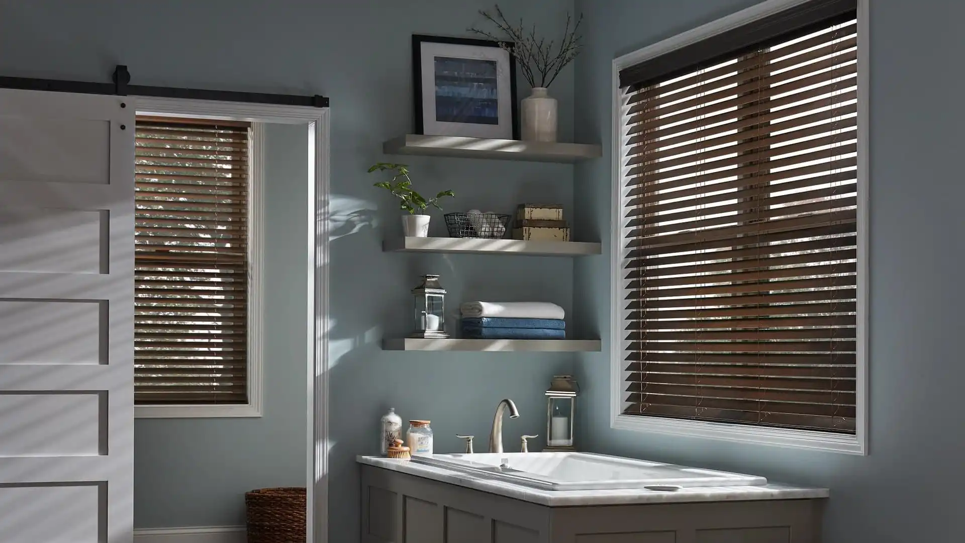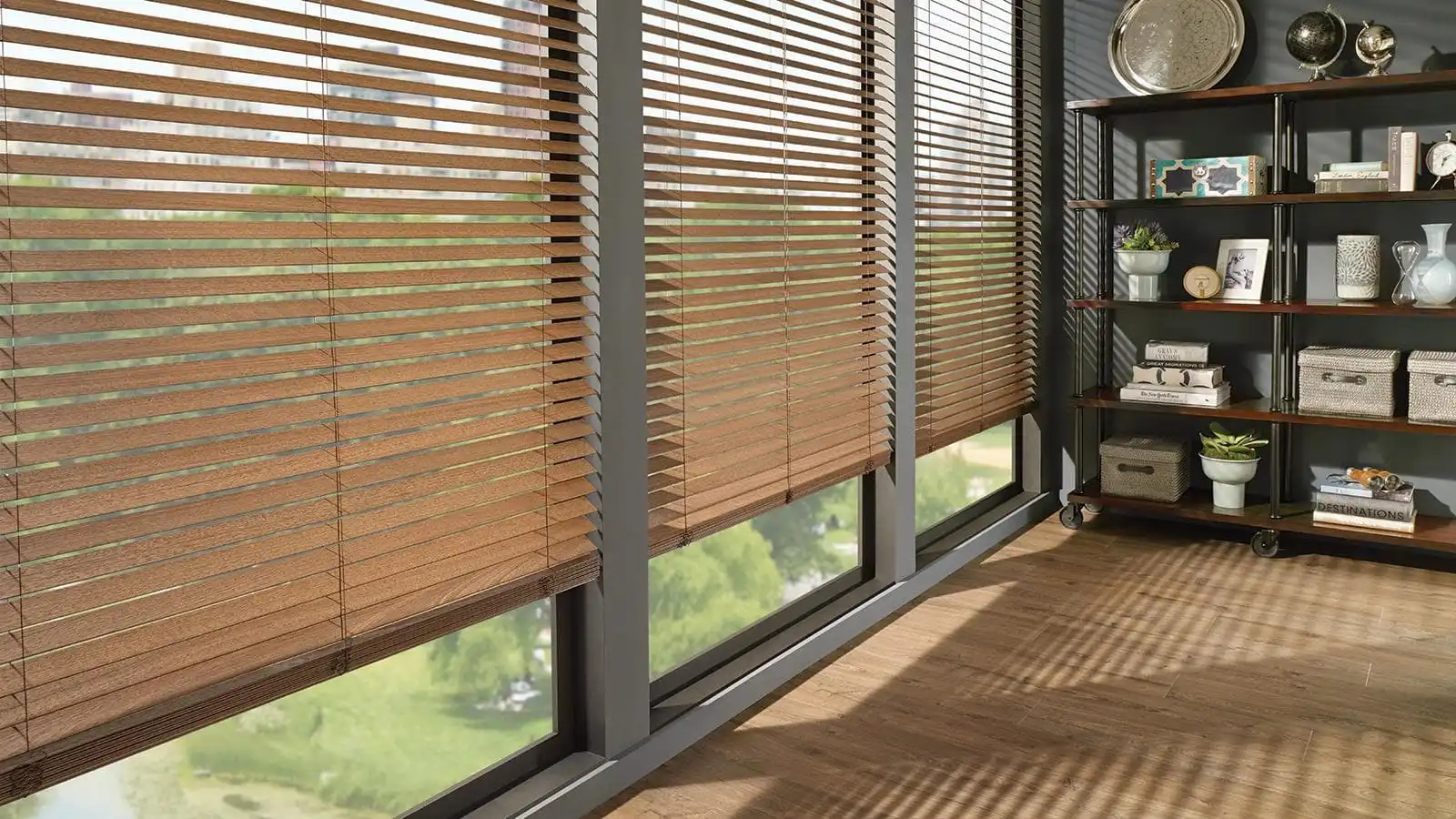 Wood window blinds are a popular window treatment because they blend with almost any décor while offering richness, texture, and effective light blocking. Naturally energy-friendly, our premium woods are chosen for their high-end appearance and equally high performance. With cordless options and a variety of valances to finish the look, find the perfect wooden blinds to spruce up any room.
