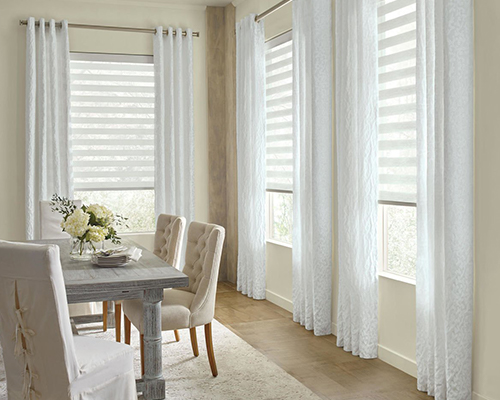 Incorporating the soft romance of sheers with the drama of drapes, Luminette® Privacy Sheers softly diffuse the sunlight. These sheers also have rotating fabric vanes, which give you 180 degrees of light control.